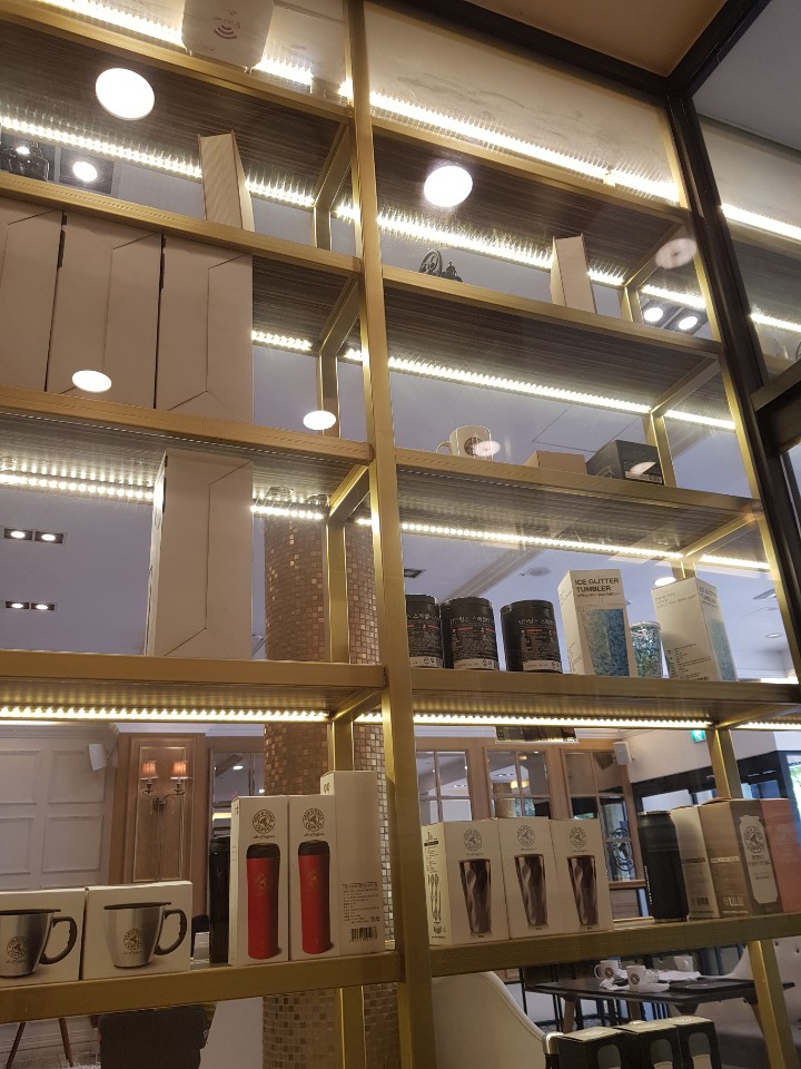 실내에 장식을 위해 골드 미러 유리를 부분적으로 인테리어 효과를.....