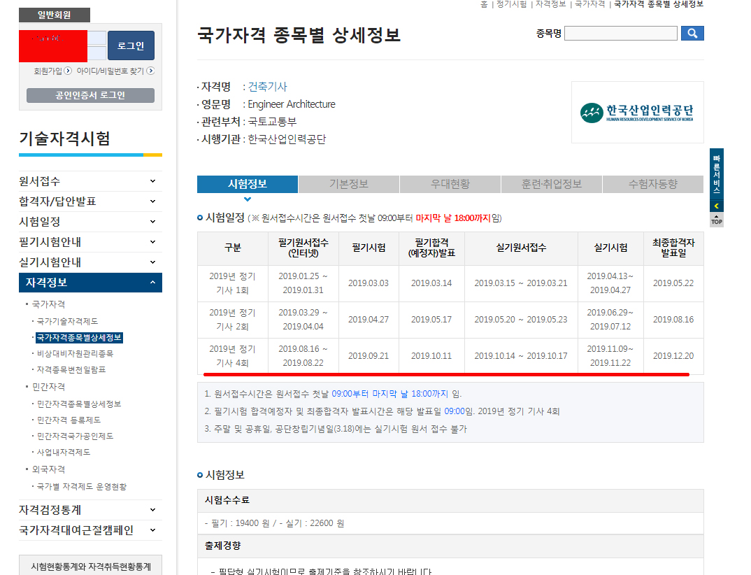 시험수수료는 필기는 19.400원이며 실기는22.600원입니다