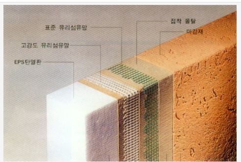 드라이비트 단열재 구조. 맨 왼쪽 (안쪽)에 EPS