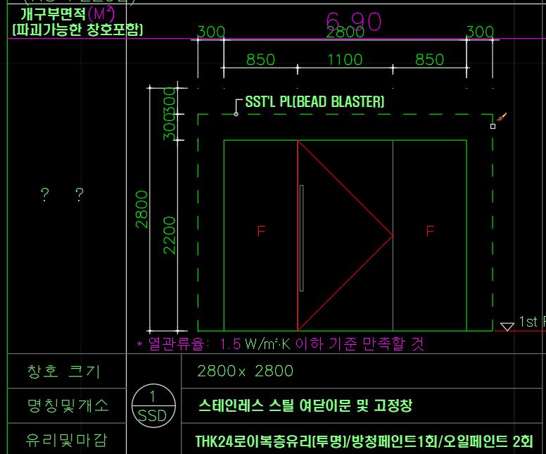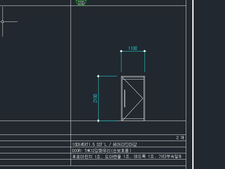 100*45 폭에 1.5 두께의 스텐 헤어라인으로 설치 유리는