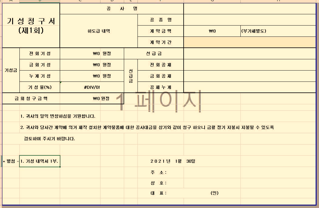 보탬이 되기 위해 기성 청구 양식을 만들어 보았습니다.