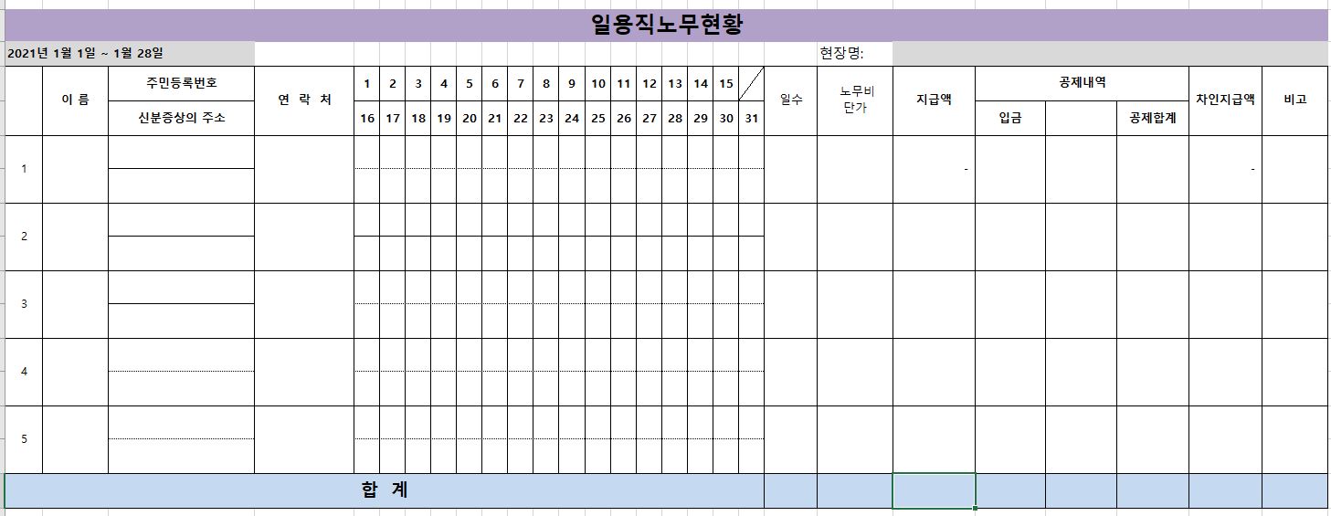 일용직 노무 지급내역서 양식을 만들어 보았습니다.