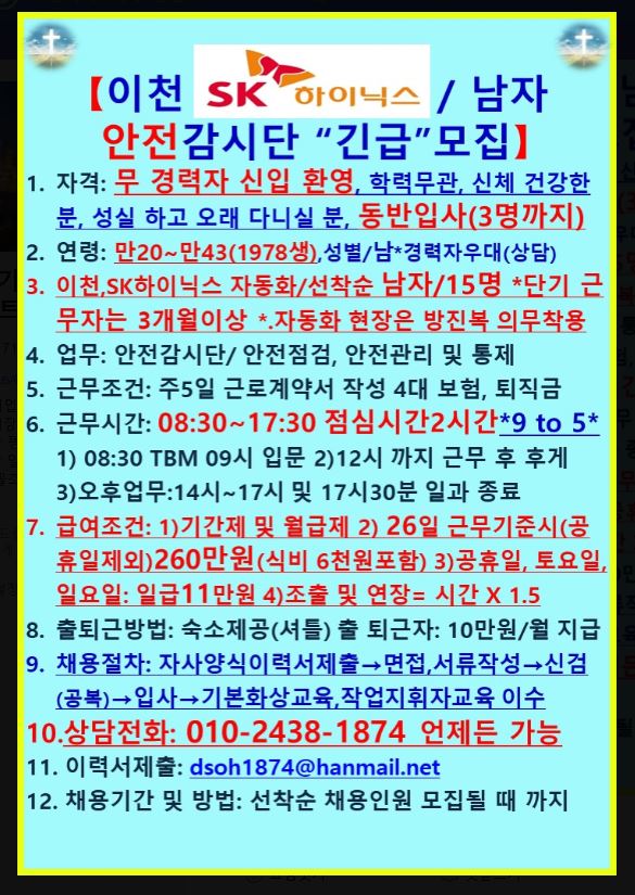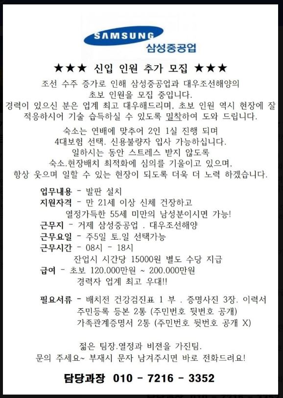 숙소는 1인1실에 사대보험필에 30대이상구인합니다.