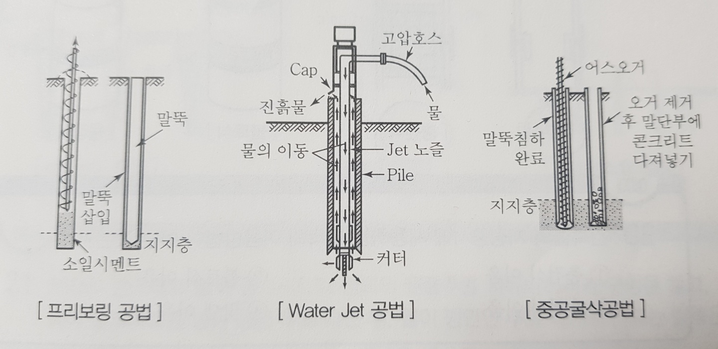 프리보링 공법 - 미리 구멍을 뚫고 굴착한 후에 말뚝을 타입하는 공법이다