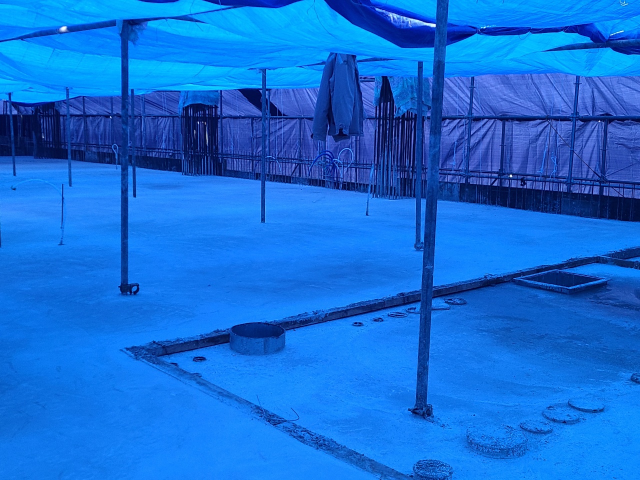 ▶ 콘크리트면 고르기 후 쇠흙손으로 발자국 등을 지우면서 천막지 지붕으로 덮어 나옴