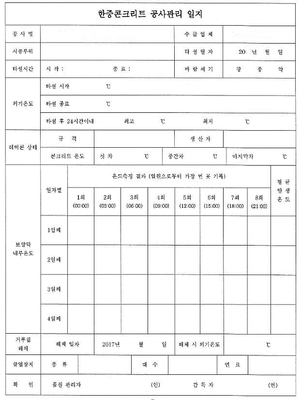 일자, 외기온도(최저, 최고) 양생온도, 콘크리트 강도를 기록하고 감독에게