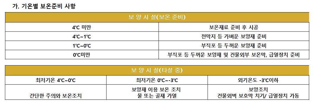 ▶ 양생 기간 중 급열 장치의 정상 가동 여부, 화재 예방, 보양시설의 파손 등을 관리할 수 있는 인원 배치