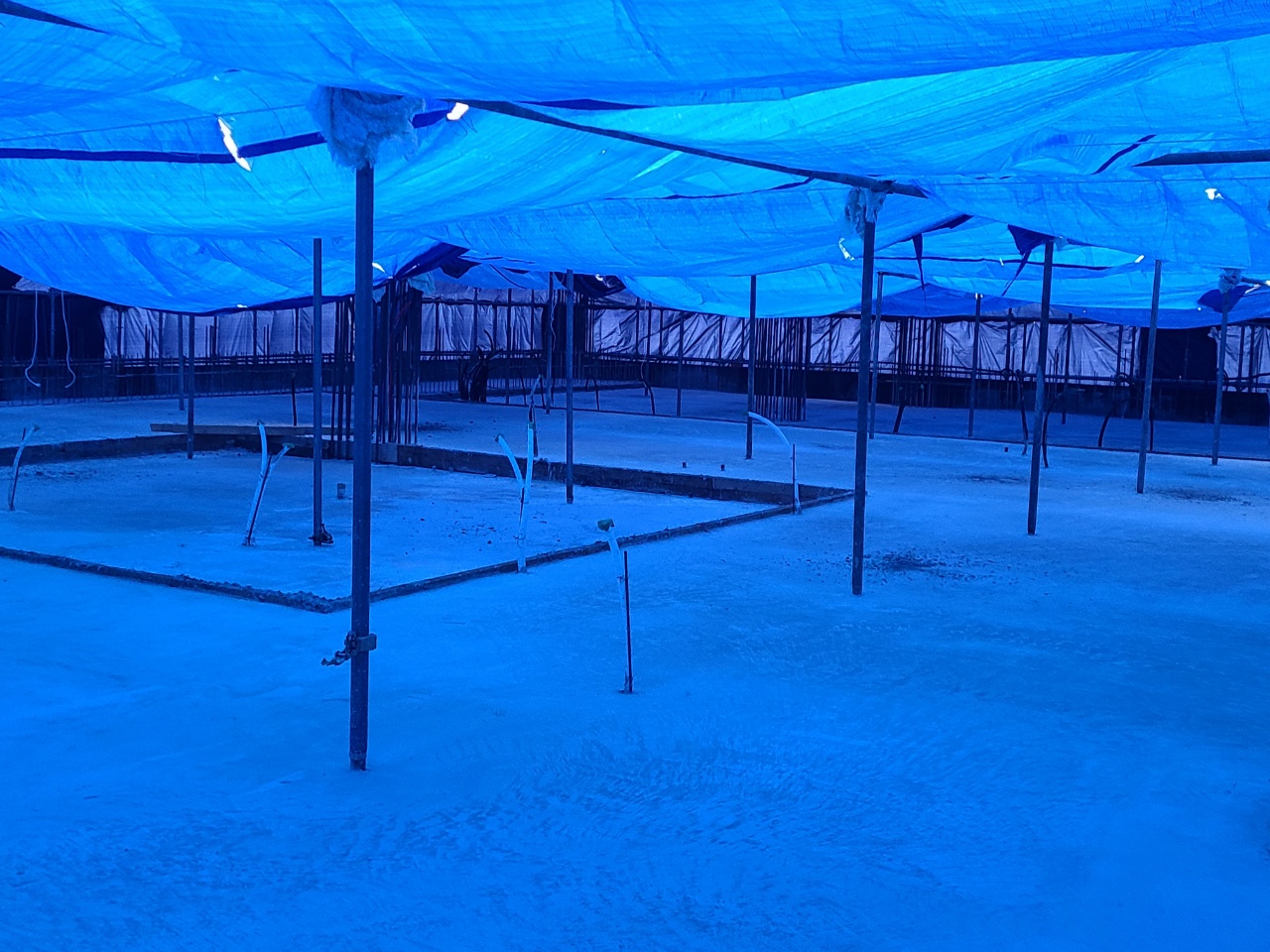 ▶ 콘크리트면 고르기 후 쇠흙손으로 발자국 등을 지우면서 천막지 지붕으로 덮어 나옴
