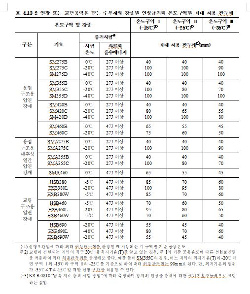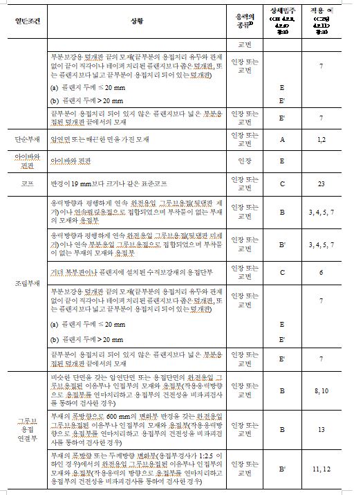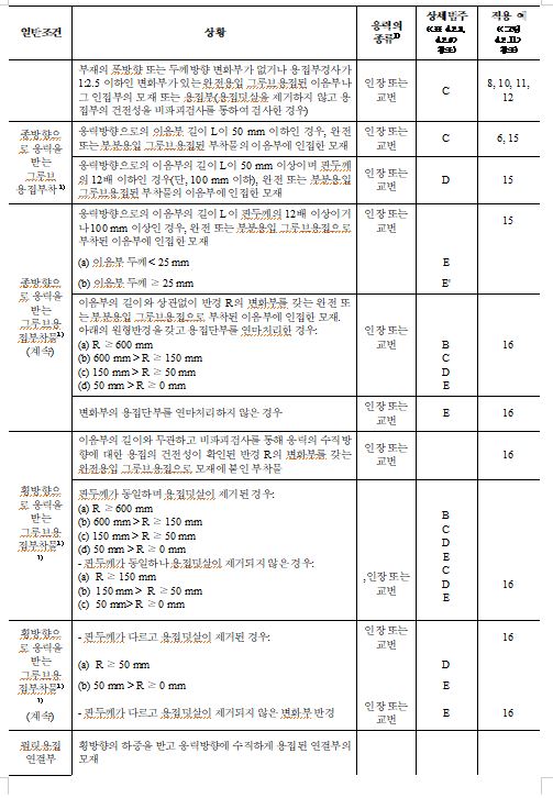 | 주) ① 강도가 다른 강종을 연결하는 경우의 용접부의 허용응력은 강도가 낮은 강종에 대한 값을 취한다. ② 비고 ①에 있어서의 부재의 순단면적은 총단면적에서 볼트구멍에 의해서 손실된 단면적을 제외한 것을 말한다. ③ 비고 ④ 및 ⑧에 있어서 맞대기 용접의 경우 주요 부재에 관해서는 방사선 검사 또는 초음파 탐사검사를 행해야 한다. 방사선 검사의 합격 기준은 KS B0845(강용접 이음부의 방사선 투과 시험방법)에 따라서 인장이음은 2류 이상, 압축이음은 3류 이상으로 하고 KS B0896(강 용접부의 초음파 탐상시험방법)에서는 2류 이상으로 해야 한다. ④ 비고 ⑧에 있어서 용접선 방향의 인장, 압축의 경우는 100%로 해야 한다. |