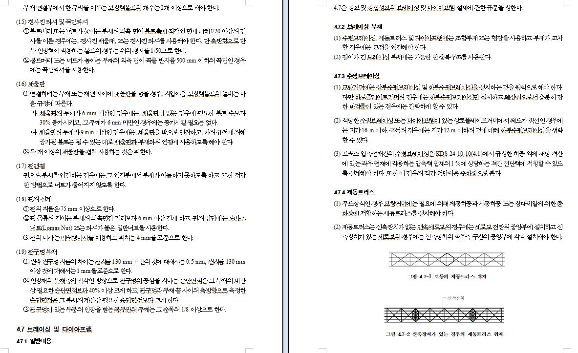 ② 부모멘트 구역뿐만 아니라 추가로 정모멘트 구역 플레이트거더의 상부 플랜지에 대해서도 4.7의 규정에 따라 브레이싱을 설치하고 길이에 관계없이 모든 하부플랜지에는 연속 횡방향 브레이싱을 설치한다.
