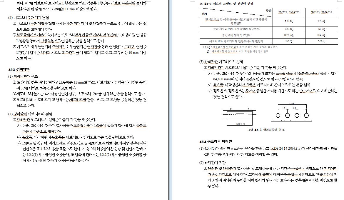 가. 트러스 또는 하로플레이트거더의 바닥틀은 일반적으로 세로보와 가로보에 의해 구성된 격자구조가 많다. 이 같은 바닥틀에 하중을 재하하면 각 부재는 수직면 내에 휨이 생기게 하지만 동시에 트러스의 현재가 힘을 받아 그 길이가 변화하고 그 영향이 바닥틀에도 전달되어 수평면 내의 변형을 일으킨다. 거더 전체 길이가 길어지게 되면 가로보 플랜지에는 큰 응력이 발생할 가능성이 있기 때문에 4.5.2(1)에 규정한 바와 같이 세로보에 신축장치를 두도록 하고 있다.