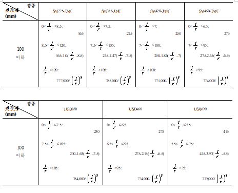 축방향응력 | 16이하 | 140 | 165 | 165 | 190 | 215 | 245 | 250 | 270 | 275 | 330 | ① | |