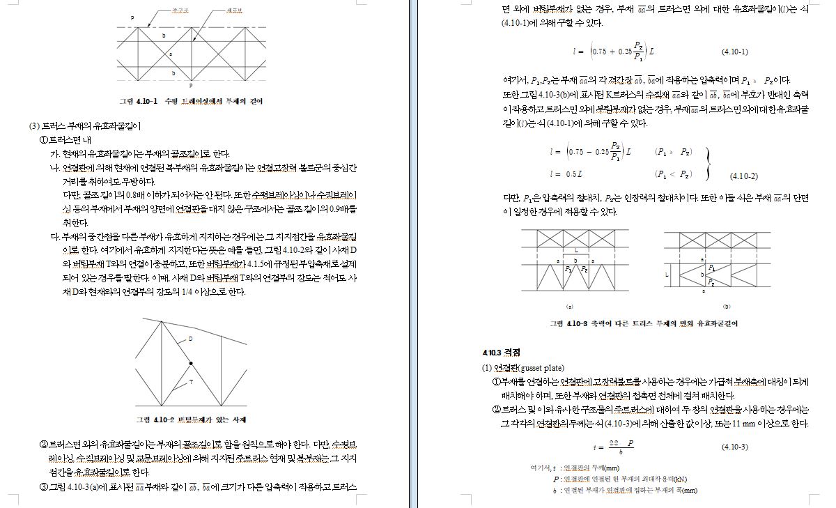 가. 일반 트러스에서는 격점을 회전이 자유로운 힌지로 생각해서 축방향 응력만으로 설계하는 것이 보통이다. 그러나 격점을 힌지로 본 결합 트러스도 핀 결합부분의 녹 등에 의해서 마찰이 증가하고 상당한 2차응력이 발생되며, 특히 격점이 리벳 또는 고장력볼트 결합의 경우는 거의 강결의 상태에 있어 큰 2차응력을 발생시킬 수 있으므로 이에 대한 검토를 해야 한다.