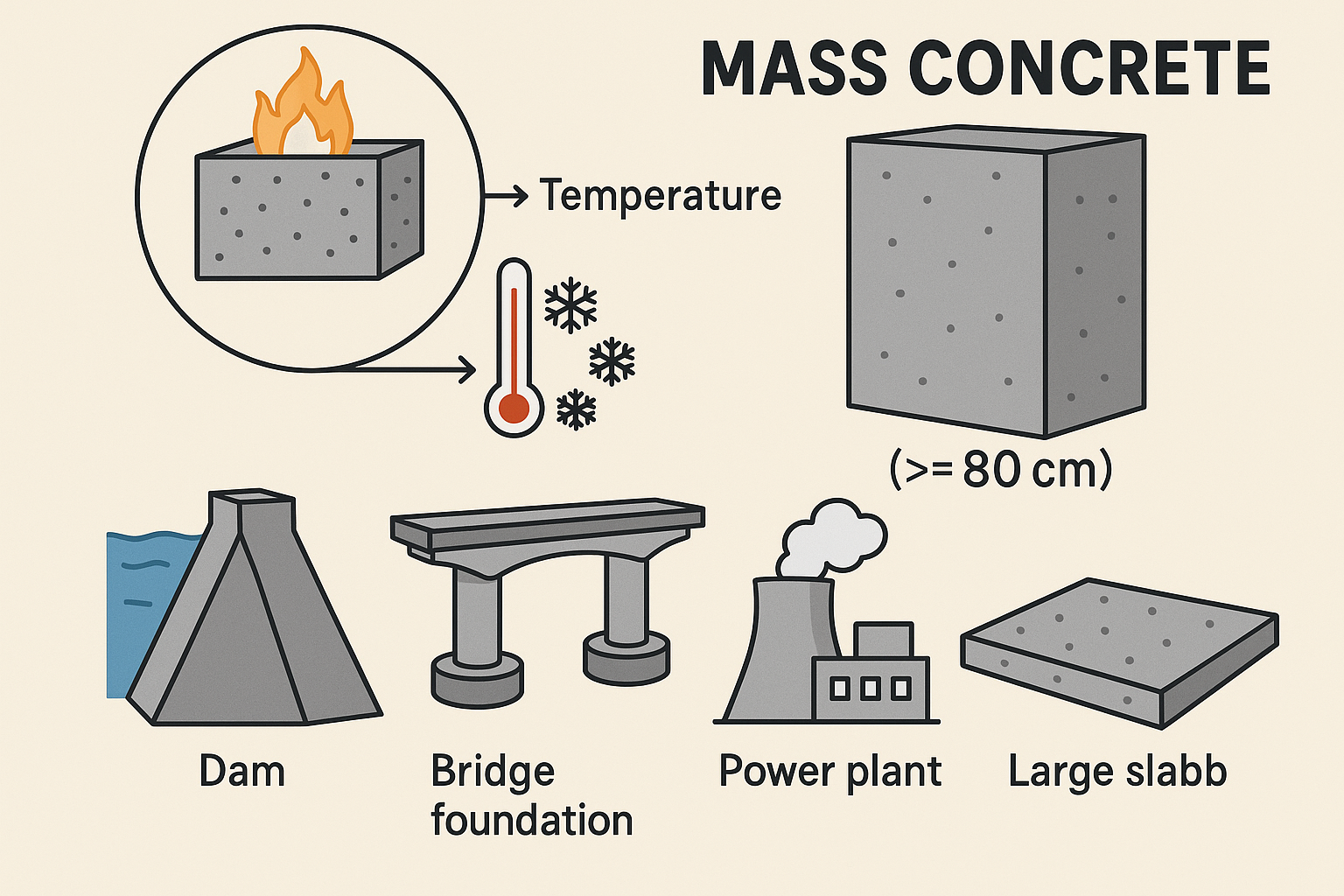 수화반응(시멘트가 물과 반응)으로 내부 온도가 크게 올라가는데, 외부와 온도 차이가 심하면 **균열(Cracking)**이 발생할 수 있습니다.
