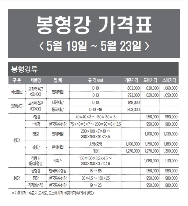 판재류 철 가격표 5월19일 부터 5월 22일