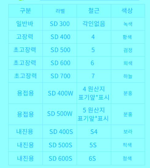 SD 700 을 사용하며 철근단위중량 용접용으로는 SD400S ,